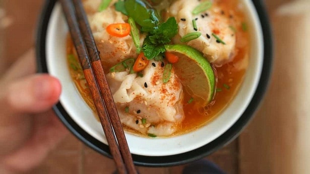 • 2 كوب ( 480 مل ) مرق دجاج • 8 قطع وانتون جمبرى طازج أو مجمد • 2 ملعقة كبيرة زيت السمسم • 2 ملعقة صغيرة صلصة الصويا • 1 ملعقة صغيرة معجون طماطم • 1 ملعقة صغيرة صلصة حارة • 2 ملعقة صغيرة صلصة السمك • 1 ملعقة صغيرة عصير ليمون • 1 حبة بصل أخضر • 2 ملعقة صغيرة زنجبيل طازج مبشور • 1 حبة كرات أو بصل مفروم • 1 فص ثوم صغير مفروم • سمسمطريقة التحضير :