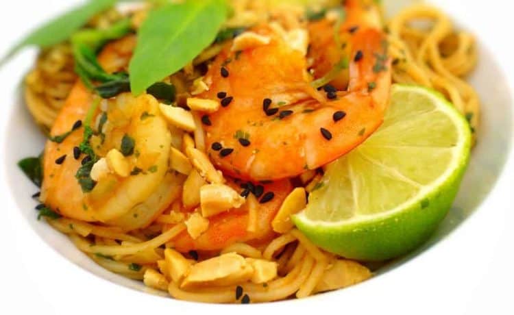 • 200 جرام نودلز الارز ( شعيرية صينية ) • 8 حبة روبيان طازج أو مجمد • 3 ملعقة كبيرة بصل مفروم • 1 فص ثوم صغير مفروم • 2 ملعقة كبيرة زنجبيل طازج مبشور • 1 ملعقة كبيرة سكر بنى • 1 ملعقة كبيرة صلصة الصويا • 3 ملعقة صغيرة صلصة المحار • 1 ملعقة كبيرة صلصة السمك • 1 ملعقة كبيرة صلصة الفلفل الأحمر الحارة ( صلصة حارة ) • 3 ملعقة صغيرة عصير ليمون • باقة من الريحان الطازج • 2 ملعقة كبيرة زيت نباتىطريقة التحضير :