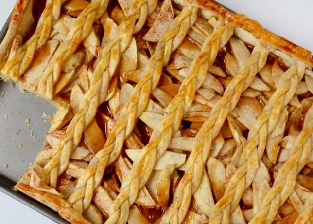 • عجينة التارت • 6 حبة تفاح مقطعة شرائح رقيقة • 4/1 كوب سكر • 2 ملعقة كبيرة نشا الذرة • 2 ملعقة صغيرة قرفة مطحونة • 2 ملعقة كبيرة عصير ليون • قطع كراميل مفرومة • 1 حبة بيض، كبيرة الحجم