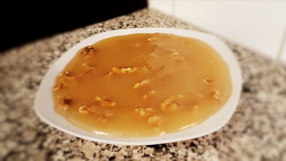 وبنكهة ماء الورد والمستكة ومرصعة بالجوز لديها مظهر براق ولون شفاف .