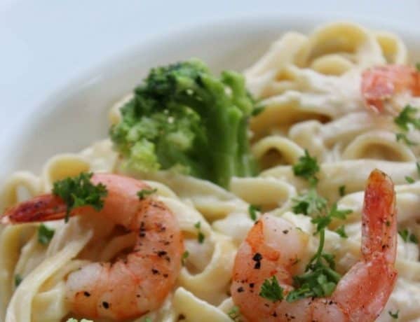 • ملعقة كبيرة زبدة<br /> • 2/1 1 ملعقة صغيرة ثوم مفروم<br /> • 2/1 كوب كريمة طبخ ( كريمة لباني )<br /> • 4/3 كوب حليب كامل الدسم<br /> • 3/1 كوب جبن بارميزان مبشور<br /> • 1 صفار بيض مخفوق<br /> • ملعقة صغيرة قشدة حامضية ( ساور كريم )<br /> • 2 ملعقة كبيرة بقدونس مفروم<br /> • ملح وفلفل<br /> • زيت زيتون<br /> • 6 روبيان متوسط الحجم<br /> • 56 جرام بروكلي<br /> • 225 جرام مكرونة فيتوتشيني ( شرائط )طريقة التحضير :