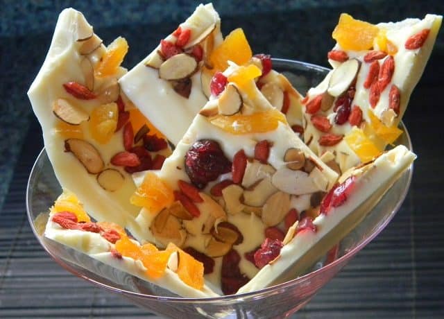 • شوكولاتة بيضاء مذابة • 4/1 كوب توت مجفف • 4/1 كوب مشمش مجفف مفروم • 4/1 كوب ربع لوز محمص مفروم • 4/1 كوب توت طازجطريقة التحضير :