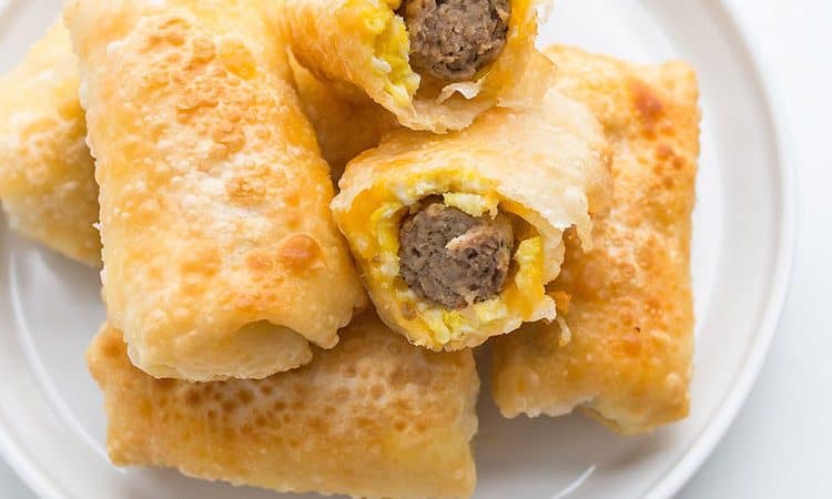• 1 ملعقة كبيرة زبدة • 3 حبة بيض مخفوقة • 4/1 ملعقة صغيرة ملح • 6 شرائح سبرنج رول • 4/3 كوب مبشور جبن الشيدر • 6 أصابع سجق مطبوخ • زيت للقليطريقة التحضير :