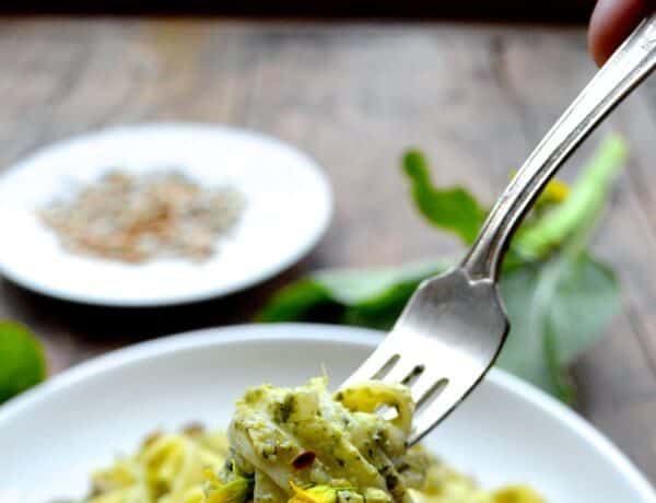 – الباستا المسلوقة – خليط السبانخ – برش الليمون – رقائق الفلفل الأحمر الحار – ماء