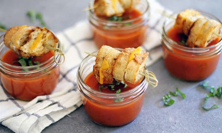 • 3 شرائح جبن شيدر • مايونيز • 16 شريحة خبز الباجيت الفرنسي • زبدة • شوربة كريمة الطماطم • ريحان طازج • أوعية زجاجية صغيرة