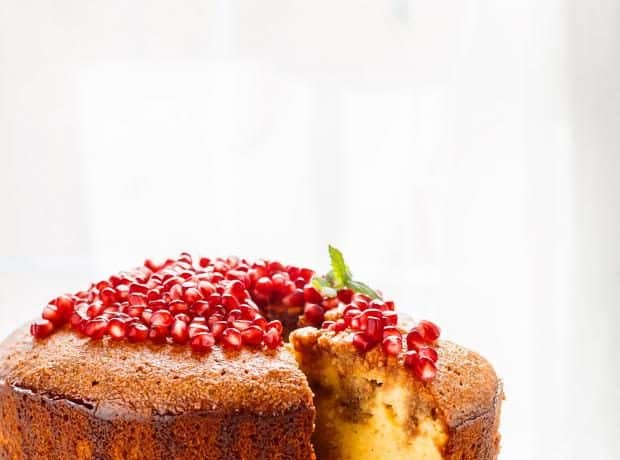 قدمي كيك البرتقال باللوز والرمان مع الشاي واستمتعي به،