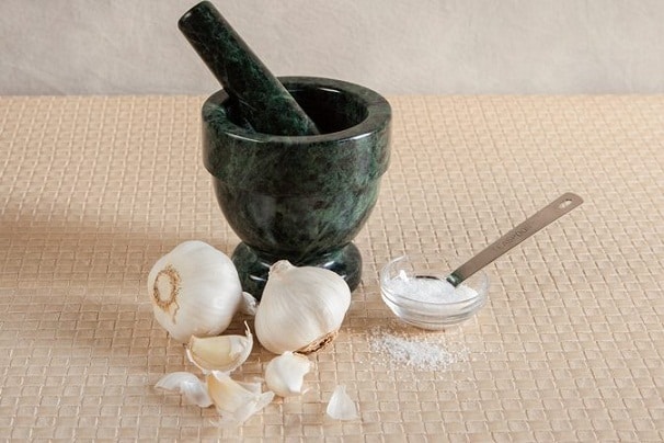 جداً ، ضعى الثوم فى مدق الهاون الخشبى مع ملعقة صغيرة من الملح ( الملح يساعد على