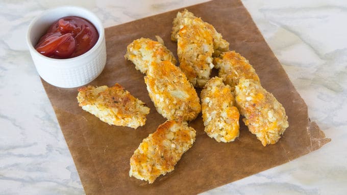 • 2 كوب زهيرات قرنبيط، حوالي 2/1 1 رطل • 2/1 كوب بصل مفروم أو مبشور • 2/1 كوب فتات الخبز (بقسماط) • 2/1 كوب مبشور جبن الشيدر • 4/1 كوب مبشور جبن البارميزان • 1 حبة بيض مخفوقة • ملح وفلفل، حسب الذوق • كاتشب، للتقديم
