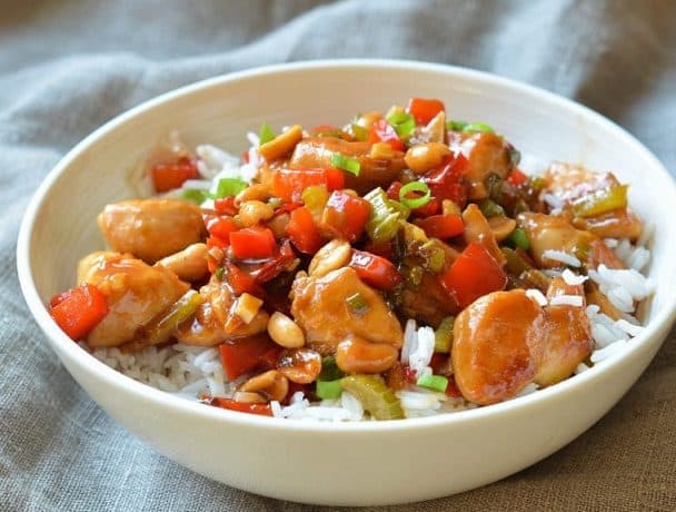 قدمى دجاج كونغ باو اللذيذ مع الأرز الأبيض .