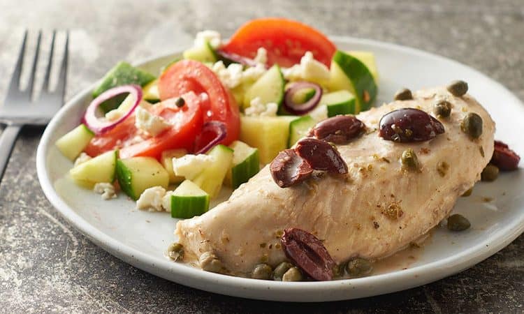 • 4 قطع صدور الدجاج (بدون جلد أو عظم) • 2/1 ملعقة صغيرة ملح • 4/1 ملعقة صغيرة فلفل أسود • 1 كوب زيتون كالاماتا • 3/1 كوب نبات الكبر • 1 كوب دريسينج السلطة اليونانية للسلطة اليونانية: • 1 حبة بصل أحمر، مقطعة شرائح • 2/1 كوب جبن فيتا • 4/1 كوب دريسينج السلطة اليونانيةطريقة التحضير :