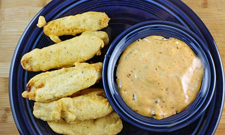 • 4 حبة خيار مخلل • 1 كوب طحين • 1 كوب طحين الذرة • 2 ملعقة كبيرة بابريكا • 1 كوب حليب • ملح وفلفل • 1 كوب مايونيز • 1 ملعقة كبيرة كاتشب • 1 قرن فلفل حار، اختياري • زيت للقليطريقة التحضير :
