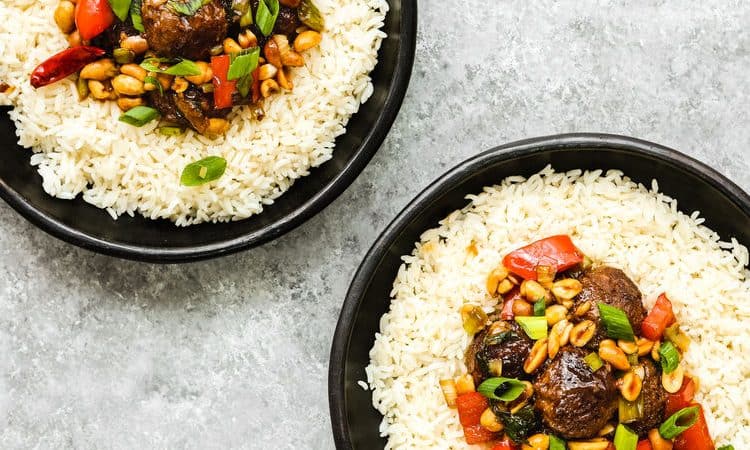قدمي كفتة كونغ باو مع الأرز الأبيض.