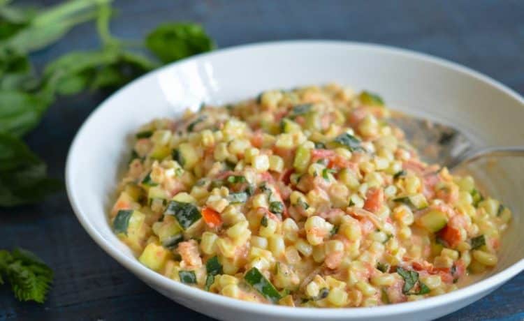 • 1 ملعقة كبيرة زيت زيتون • ½ كوب كراث مفروم • 1 فص ثوم مفروم • 4/1 2 كوب من حبات الذرة الطازجة • 2/1 1 كوب من مكعبات الكوسا الصغيرة • 2/1 1 كوب من مكعبات الطماطم الصغيرة • ¾ ملعقة صغيرة ملح • ¼ ملعقة صغيرة فلفل أسود • ½ ملعقة صغيرة سكر • 100 جرام جبن الماعز • 2 ملعقة كبيرة ريحان طازج مفرومطريقة التحضير :