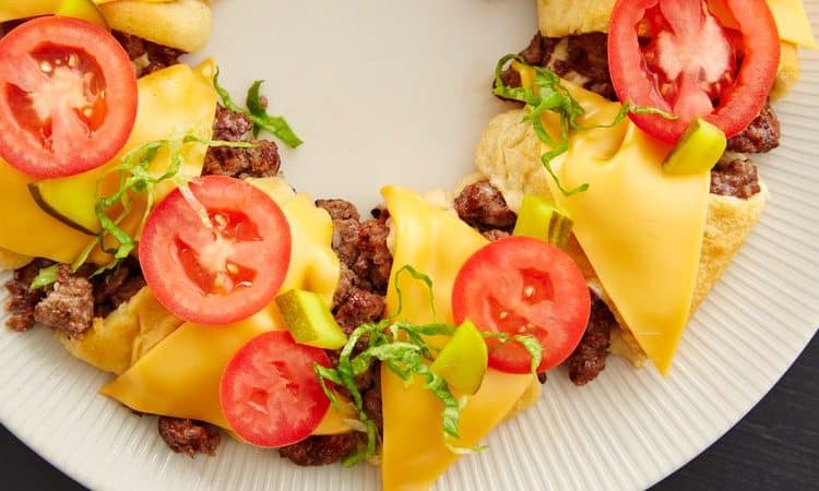 • 450 جرام لحم بقري مفروم • 4/1 كوب بصل مفروم ناعماً • ملح وفلفل حسب الذوق • 225 جرام عجينة البيتزا • 4 شرائح جبن شيدر مقطعة نصفين • 2 كوب خس مبشور • 1 حبة طماطم، مقطعة شرائح رقيقة • 2 حبة مخلل الخيار، مقطعة مكعبات • 4/1 كوب مايونيز • 4/1 كوب كاتشبطريقة التحضير :