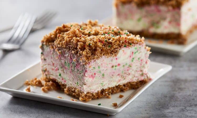 - 500 جرام بسكويت كرانش مطحون (جرانولا أو أي نوع آخر)<br /> - 2/1 كوب زبدة مذابة<br /> - 3/2 كوب سكر<br /> - 225 جرام جبن كريمي<br /> - 393 جرام حليب مكثف محلى<br /> - 225 جرام كريمة مخفوقة<br /> - 2/1 ملعقة صغيرة نكهة اللوز<br /> - 1 ملعقة كبيرة فانيليا سائلة<br /> - 3/1 كوب شوكولاتة فارمسيل أو سكاكر ملونة (أخضر، أحمر، أبيض)طريقة التحضير :
