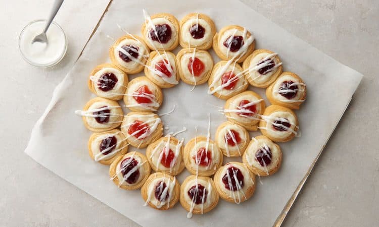 • 450 جرام عجينة البف باستري • 168 جرام جبن كريمي • 4/3 كوب مسحوق السكر • 4/1 كوب مربى فراولة أو توت للتوبينغ: • 4/1 كوب مسحوق السكر • 1 – 2/1 1 ملعقة صغيرة حليبطريقة التحضير :