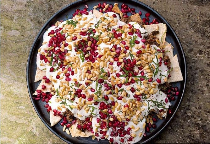 اللحم أو الخضار أو البقول مع خبز محمص وطبقة نهائية من اللبن الزبادى بنكهة الثوم