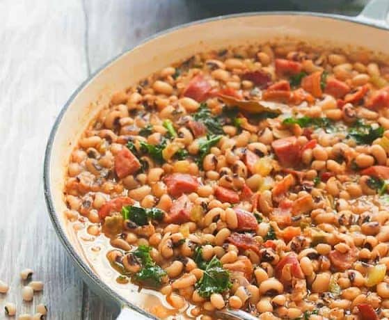 • 450 جرام لوبيا (فاصوليا أم عيون سوداء) • 4 : 5 قطع من مكعبات اللحم البقرى صغيرة الحجم • 1 كوب مكعبات نقانق أو مرتديلا ديك رومى مدخن • 1 حبة بصل كبيرة مقطعة مكعبات • 1 ساق كرفس مقطع مكعبات • 2 : 3 ملعقة صغيرة من الثوم المفروم • 1 حبة فلفل أخضر حار ( اختياري ) • 2 ملعقة صغيرة زعتر طازج مفروم • 1 ورق غار • 1 : 2 ملعقة صغيرة من البهارات المشكلة • 7 : 8 كوب من مرق الدجاج • 2 كوب سبانخ ( اختياري ) • ملح وفلفل أسود حسب الذوقطريقة التحضير :