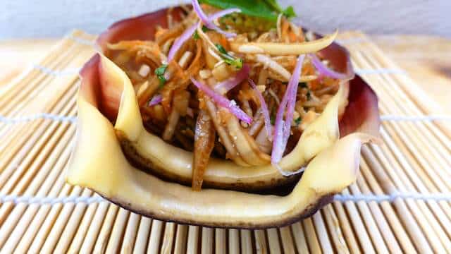 • 1 حبة جزر طازجة متوسطة الحجم مبشورة • 1 فص ثوم مفروم • 2 زهرة موز صغيرة • 1 حبة كرات صغيرة مفرومة • 1 قطعة زنجبيل طازج مفرومة • القليل من الفول السودانى المملح • 1 ملعقة كبيرة أنشوجة معلبة ( اختياري ) • القليل من النعناع الطازج • 2 ملعقة كبيرة سكر • 2 ملعقة كبيرة صلصة السمك • 1 ملعقة كبيرة صلصة الصويا • 1 ملعقة كبيرة صلصة حارة • 2 حبة ليمون طازجطريقة التحضير :