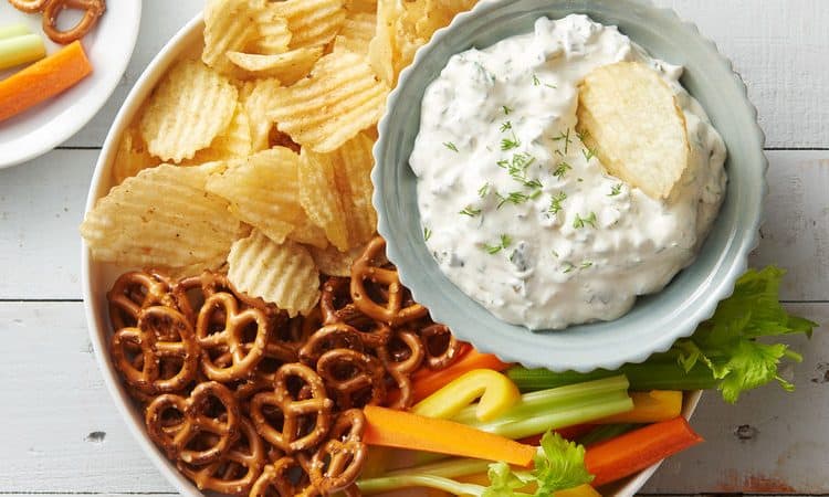 قدمي تغميسة الجبن ومخلل الخيار مع الشيبسي والبريتزل