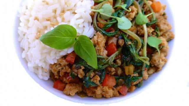 • 300 جرام لحم دجاج مفروم • 1 فص ثوم مفروم • 1 حبة بصل أحمر صغيرة مفرومة • 2 ملعقة صغيرة زنجبيل طازج مبشور • 1 ملعقة كبيرة صلصة حارة • 1 ملعقة كبيرة صلصة المحار • 2 ملعقة كبيرة صلصة السمك • 1 ملعقة كبيرة صلصة الصويا • 1 ملعقة صغيرة سكر بنى • باقة من الريحان الطازج • 1 حبة طماطم مقطعة مكعبات صغيرة (اختياري) • زيت نباتىطريقة التحضير :