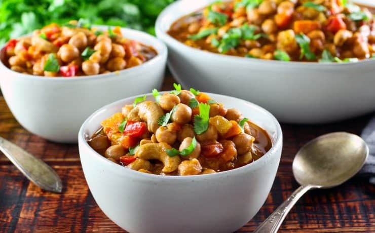• 4/1 5 كوب من الحمص المسلوق • 2 حبة جزر متوسطة الحجم مقشرة ومقطعة صغيرة • 2 ساق من الكرفس، مكعبات صغيرة • 2 حبة بصل متوسطة الحجم، مكعبات صغيرة • 2 حبة من الفلفل الأحمر الحلو، منزوع البذور، مكعبات صغيرة • 2 ملعقة صغيرة ملح، مقسمة • 2 ملعقة كبيرة ثوم مفروم • 3/4 1 كوب مكعبات الطماطم، مقشرة • 4/1 كوب خل أبيض • 1 حبة بطاطا حلوة متوسطة الحجم، مقشرة ومقطعة • 2 كوب من الكاجو الخام • 4/1 كوب زيت زيتون • 2 ملعقة صغيرة سكر • 2/1 1 ملعقة صغيرة كاري • 2/1 1 ملعقة صغيرة من مسحوق الفلفل الحار • 1 ملعقة صغيرة كمون • 1 ملعقة صغيرة بابريكا • 2/1 ملعقة صغيرة بهارات • 2/1 ملعقة صغيرة زنجبيل • 4/1 ملعقة صغيرة قرفة • 2/1 3 كوب مرق الخضار أو أكثر إذا لزم الأمر • البقدونس الطازج أو الكزبرة، للتزيينطريقة التحضير :