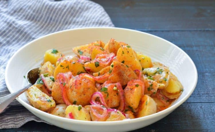 • 2/1 1 كيلو من البطاطا الصغيرة الحجم • 2 ملعقة كبيرة ملح • 2/3 كوب زيت نباتى • ¼ كوب + 2 ملعقة كبيرة من الخل الأبيض • 1 ملعقة كبيرة سكر • 1 ملعقة صغيرة بابريكا + المزيد للتزيين • 1 ملعقة صغيرة فلفل أسود • 1 حبة بصل أحمر متوسطة مقطعة شرائح رقيقة جداً • ½ كوب بقدونس مفروم + المزيد للتزيينطريقة التحضير :