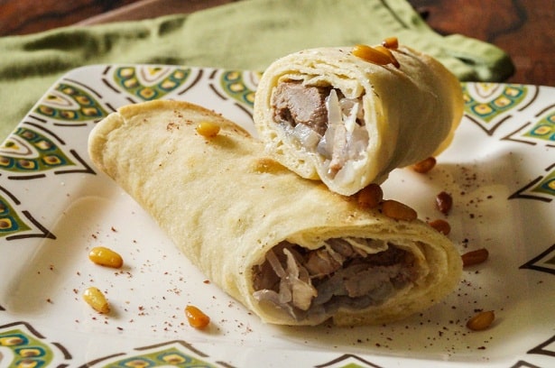 يتميز بنكهة السماق مع البصل المكرمل ويُغطى بالدجاج ويُقدم داخل لفافات من الخبز