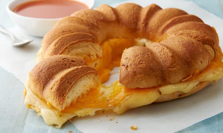 • 450 جرام عجينة الخبز أو الكرواسون • 4 ملعقة كبيرة زبدة • 2/1 ملعقة صغيرة مسحوق الثوم • 6 شرائح جبن شيدر، مقطع أنصاف • 6 شرائح جبن موتزاريلا، مقطع أنصاف • 6 شرائح جبن شيدر بالفلفل، مقطع أنصافطريقة التحضير :