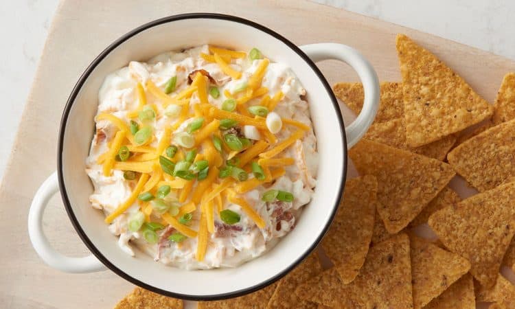 • 225 جرام جبن كريمي • 1 كوب ساور كريم • 28 جرام صوص الرانش • 2 كوب مبشور جبن الشيدر • 2/1 كوب لحم مقدد مفروم ومقلي • شرائح البصل الأخضر