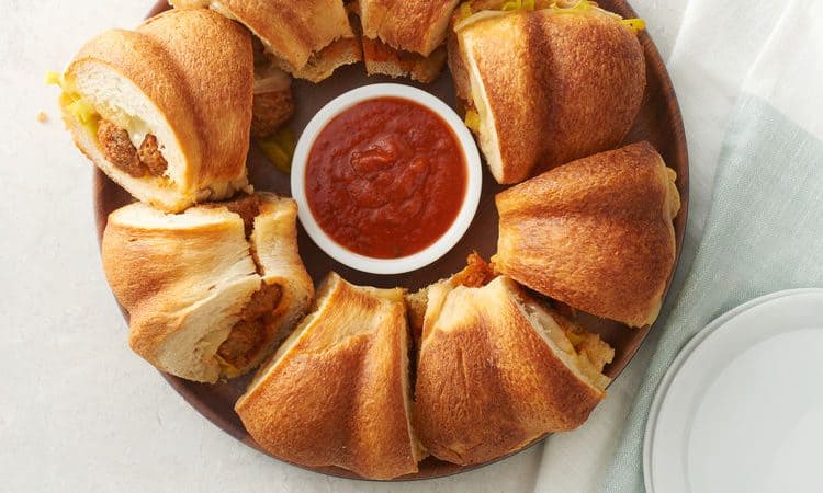 • 450 جرام عجينة الخبز أو الكرواسون<br /> • 4 ملعقة كبيرة زبدة<br /> • 2/1 ملعقة صغيرة مسحوق الثوم<br /> • 6 شرائح جبن شيدر أو موتزاريلا<br /> • 24 كرة من كرات الكفتة المطبوخة (بقري أو دجاج أو تركي)<br /> • 4/3 كوب صلصة المكرونة (صلصة مارينارا)<br /> • 3/1 كوب شرائح الفلفل المخللطريقة التحضير :