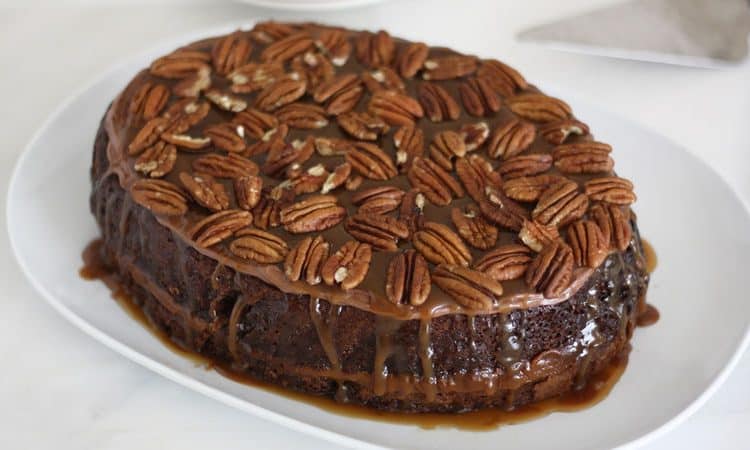 - خليط كيكة الشوكولاتة - صوص الكراميل - كريمة الزبدة بالشوكولاتة - جوز أو أي نوع مكسرات (للتزيين)طريقة التحضير :