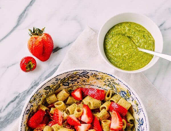 • 1/3 كوب جوز أو صنوبر أو لوز أو بندق • 1 كوب أوراق ريحان طازجة • 1 كوب أوراق نعناع طازجة • 1/3 كوب جبن بارميزان • 3 فص ثوم مهروس • ملح و فلفل أسود حسب الرغبة • ½ كوب زيت زيتون • 225 جرام مكرونة خواتم مسلوقة • 8 حبات طماطم مجففة مقطعة شرائح رقيقة • ½ لتر طماطم كرزية مقطعة أنصاف • فراولة مقطعة أرباع