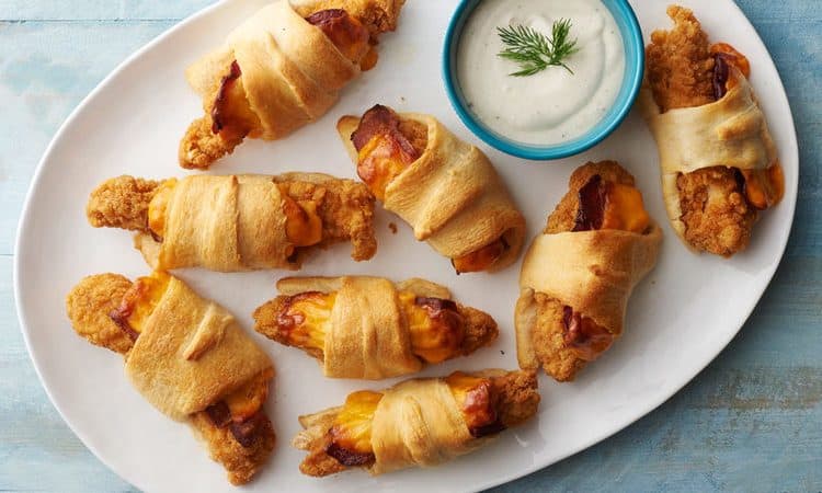 • 225 جرام عجينة البيتزا أو الكرواسون • 8 شرائح دجاج ستربس مقلي • 8 شرائح لحم مقدد مقلي • 3 شرائح جبن شيدر مقطعة إلى شرائح رقيقة • 2/1 كوب صوص الرانشطريقة التحضير :