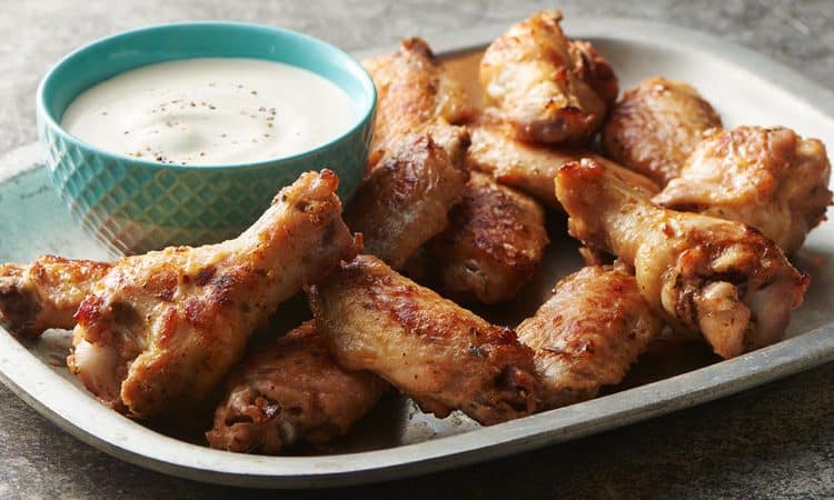 ضعي أجنحة الدجاج المشوية في طبق التقديم وقدميه مع صوص
