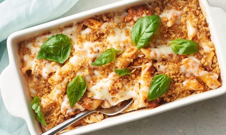 • 4/1 1 كوب مكرونة مسلوقة • 1 ملعقة كبيرة زبدة • 4/1 كوب فتات الخبز الإيطالي • 115 جرام سجق مفروم • 4/3 كوب مكعبات البصل • 2/1 1 كوب صلصة الطماطم • 2/1 1 كوب مبشور جبن الموتزاريلا • ملح وفلفل حسب الذوق • أوراق الريحان الطازجةطريقة التحضير :