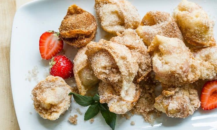 • 2 كوب زيت جوز هند أو أي نوع آخر (للقلي) • 112 جرام جبن كريمي • 2 ملعقة كبيرة سكر • 2/1 كوب مكعبات الفراولة • 15 شريحة وانتون (عجينة السبرينج رول) • 2 ملعقة كبيرة حليب • 3/2 كوب مزيج القرفة بالسكرطريقة التحضير :