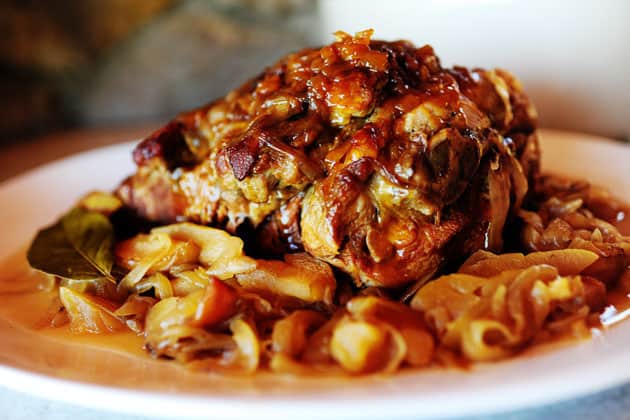 • 3 معلقة كبيرة زيت زيتون<br /> • 1 كتف ضانى بدون عظم (روستو صغير)<br /> • ملح وفلفل أسود حسب الذوق<br /> • 4 كوب عصير تفاح<br /> • 3 تفاح<br /> • 3 بصل متوسط الحجم مقطع شرائح<br /> • ورق غار (ورق لورا)طريقة التحضير :