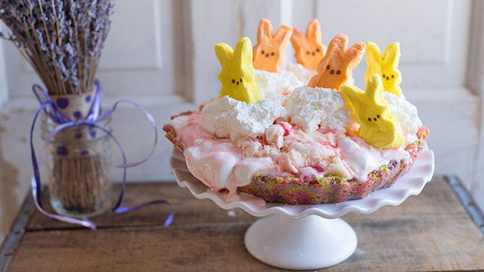 • 1 باكيت من عجين التارت الجاهز (الباى )<br /> • 3 ألوان مفضلة اليك من ألوان الطعام الطبيعية<br /> • 1 لتر ايس كريم بالفراولة<br /> • 200 جرام مارشميليو<br /> • كريمة خفق (ويبنج كريم ) (كريم شانتيه)<br /> • حلوى علي شكل أرانب للتزيين (متوفرة في السوبر ماركت)طريقة التحضير :