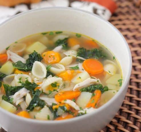• ملعقة كبيرة زيت زيتون أو زبدة قليلة الدسم • بصلة مفرومة • ساق كرفس مفروم • 2 حبة جزر مقطعة إلى شرائح رقيقة • 1 - 2 من فصوص الثوم المفروم • 1 حبة بطاطس متوسطة مقشرة ومفرومة • 1 حبة بطاطا حلوة متوسطة مقشرة ومفرومة • 8-10 أكواب مرق الدجاج أو الديك الرومي • 4/3 مكرونة ( شعرية أو الصغيرة ) • 3 أكواب من السبانخ المفروم • كوب من الدجاج أو التركي المطبوخ ( ممزق لقطع صغيرة ) • بقدونس طازجطريقة التحضير :