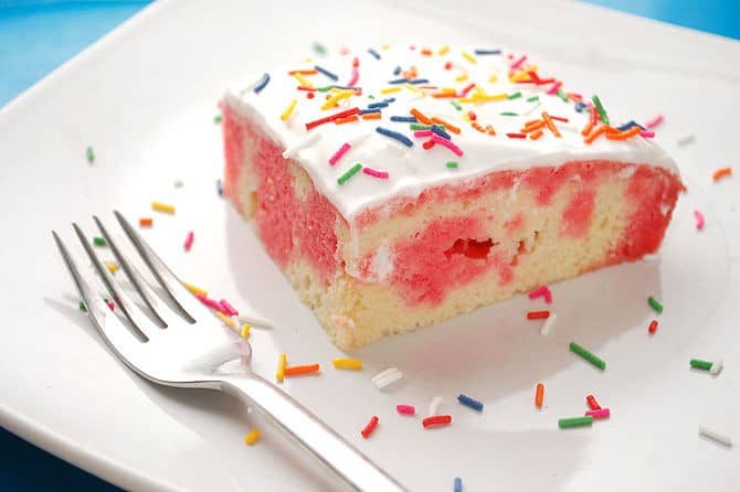 – صبي الجيلي علي الكيك بالكامل، وستجدين ان الثقوب تساعد الجيلي علي التسريب داخل الكيك .