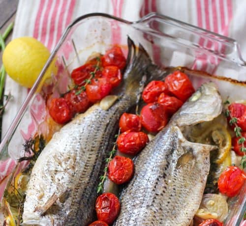 • 2 سمك بوري حوالي 400 جرام <br /> • أعشاب طازجة ( بقدونس ، كزبرة ، شبت ، زعتر ، ريحان )<br /> • ليمونة مقطعة إلى شرائح<br /> • 3-4 من بصل مقطعة إلى شرائح<br /> • 5 فصوص ثوم مقطعة إلى شرائح<br /> • 400 جرام من طماطم شيري<br /> • 4/1 كوب زيت زيتون<br /> • ملح وفلفلطريقة التحضير :