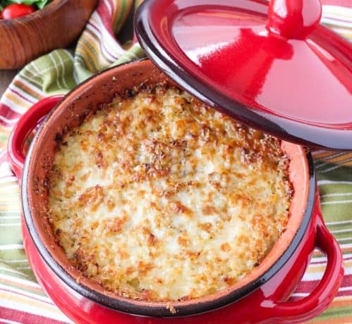 • 560 جرام بطاطس • 2/1 1 ملعقة كبيرة زبدة • بصلة كبيرة مفرومة • 2-3 فصوص ثوم مفروم • 450 جرام جبن الريكوتا • بيضة كاملة • 3 صفار بيض • كوب من جبن البازميزان مبشور ناعم • 2/1 كوب جبن الموزاريلا مبشورة ناعمة • 2/1 1 كوب كريمة لباني ( كريمة طبخ ) • ملح وفلفل • أوريجانو ( اختياري )طريقة التحضير :