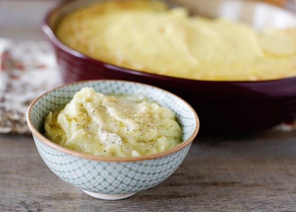 ضعي هريس البطاطس والجبن في صينية خبز خزفية مدهونة