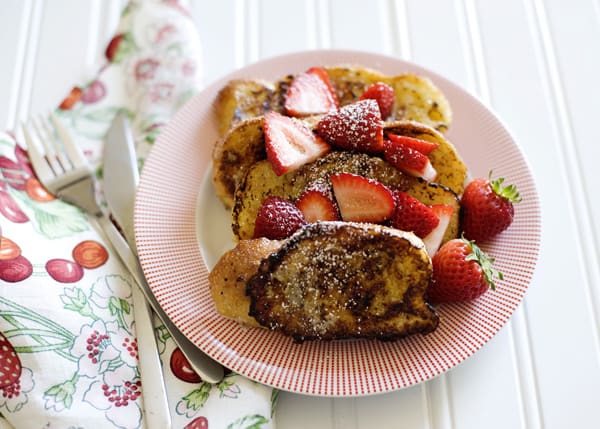 • خبز فرنسي • 3 بيضات • 3/1 كوب حليب • 2 ملعقة كبيرة سكر ( 3/1 كوب سكر ) • 8/1 ملعقة صغيرة قرفة • 8/1 ملعقة صغيرة من مبشور جوزة الطيب الطازج • 2/1 ملعقة صغيرة فانيليا سائلة • 2 ملعقة كبيرة زبدة • سكر ناعم ( سكر بودرة ) • فراولة طازجة