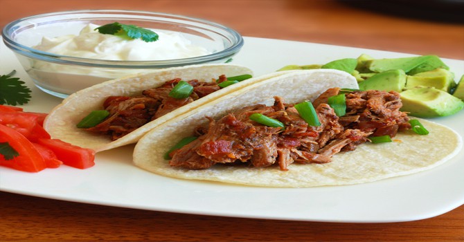 • لحم بقرى مخصص للشواء • 1 بصلة كبيرة بيضاء • 3 فص ثوم مفروم • 300 جرام بندورة (طماطم) مقطعة مكعبات • 1/2 كوب مرق دجاج • 1 معلقة صغيرة ملح • 1/2 معلقة صغيرة فلفل أسود • 1 معلقة صغيرة زعتر مجفف • 3 ورق غار ( ورق لورى) • 8 خبز التاكو أو التورتيلا • مكعبات طماطم • مكعبات أفاكادو • كريمة حامضية ( ساور كريم )