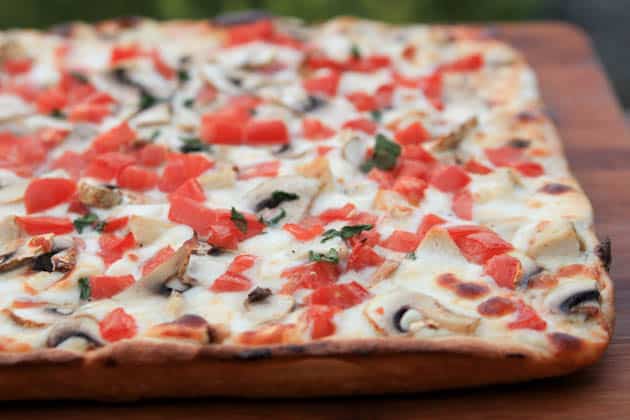 لعجين البيتزا :<br /> • 4/3 كوب ماء دافئ<br /> • ملعقة كبيرة خميرة فورية جافة<br /> • 2/1 ملعقة كبيرة عسل<br /> • 2/1 1 ملعقة كبيرة زيت زيتون<br /> • 2 كوب + 2 ملعقة كبيرة طحين<br /> • 4/3 ملعقة صغيرة ملح<br /> لصلصة الثوم :<br /> • 2 ملعقة كبيرة زبدة<br /> • 3 ملاعق كبيرة طحين<br /> • 4/1 1 كوب حليب<br /> • 4/1 ملعقة صغيرة ملح<br /> • 8/1 ملعقة صغيرة فلفل<br /> • 2 - 3 من فصوص الثوم المفروم<br /> • 2 ملعقة كبيرة ريحان طازج مفروم ناعم<br /> • 2/1 كوب مبشور جبن البارميزان<br /> لحشو البيتزا :<br /> • 12 شريحة من جبن الموتزاريلا ( أو كمية وفيرة من مبشور الموزاريلا )<br /> • 1 من صدور الدجاج ( كبير الحجم ) المقلي .<br /> • 2 حبة طماطم ( متوسطة الحجم ) مقطعة مكعبات<br /> • 2 ملعقة كبيرة من الريحان الطازج ( ممزق )<br /> • 5 حبات من الفطر ( المشروم ) مقطع شرائحطريقة التحضير :