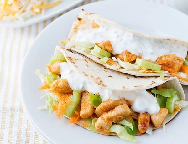 لتتبيل الدجاج : • 4 صدور الدجاج ( مقطعة قطع صغيرة ) • 2 ملاعق كبيرة طعام من توابل الدجاج • ملعقة كبيرة زيت زيتون للصوص الحار : • 3 ملاعق كبيرة زبدة • 3/1 - 2/1 كوب من الصوص الحار • 2 ملعقة كبيرة خل التفاح • 4 ملاعق كبيرة عسل • 2/1 ملعقة صغيرة ملح • 4/1 ملعقة صغيرة فلفل لصوص الريكفورد : • 2 كوب من القشدة الحامضة ( ساور كريم ) • 2/1 كوب حليب • 2 ملعقة صغيرة خل التفاح • ملح وفلفل • كوب من فتات الجبن الأزرق ( الريكفورد ) • ملعقة كبيرة شبت مفروم • ملعقة كبيرة بقدونس مفروم لعمل الساندوتش : • خبز التورتيلا • خس مبشور • جبن مبشور • كرفس مقطع شرائحطريقة التحضير :