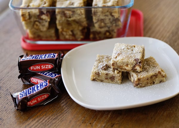 • 2/1 كوب زبدة ( في درجة حرارة الغرفة )<br /> • 2/1 كوب سكر بني<br /> • بيضة<br /> • ملعقة صغيرة فانيليا سائلة<br /> • 2/1 1 كوب طحين<br /> • 2/1 ملعقة صغيرة بكينج بودر ( مسحوق الخبز )<br /> • 4/1 ملعقة صغيرة ملح<br /> • 12 قطعة شوكولاتة سنيكرز ( الحجم الصغيرة ) مقطعة إلى أرباع