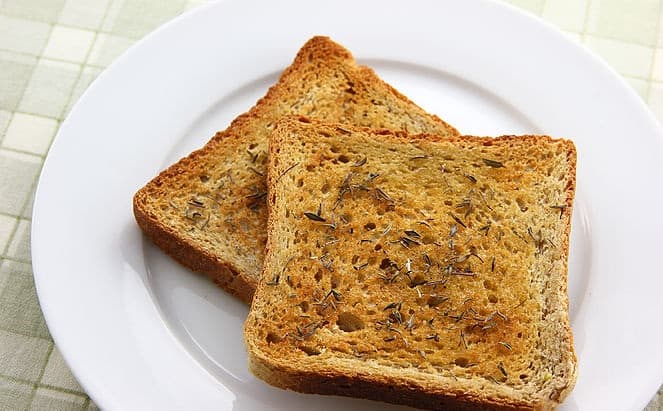 • 3 - 4 شرائح الخبز بالردة ( الخبز الأسمر )<br /> • 1 - 2 ملعقة كبيرة زيت زيتون<br /> • فص ثوم مقطع<br /> • بذور الكمونطريقة التحضير :
